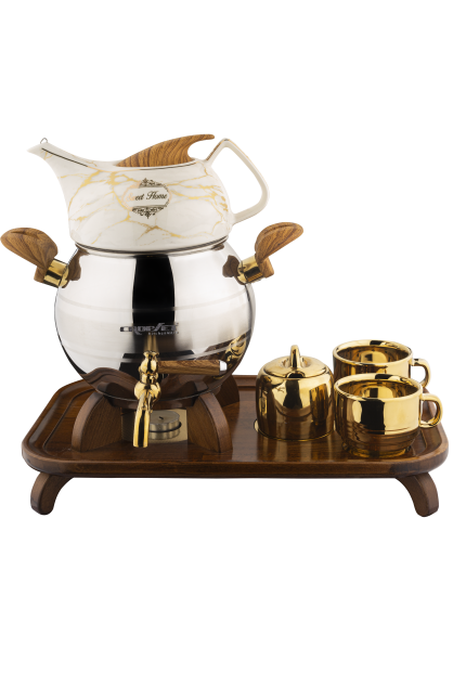 خانه کتری و قوری امکانات اضافی با پایه وارمر استیل نقره ای و طلایی براق