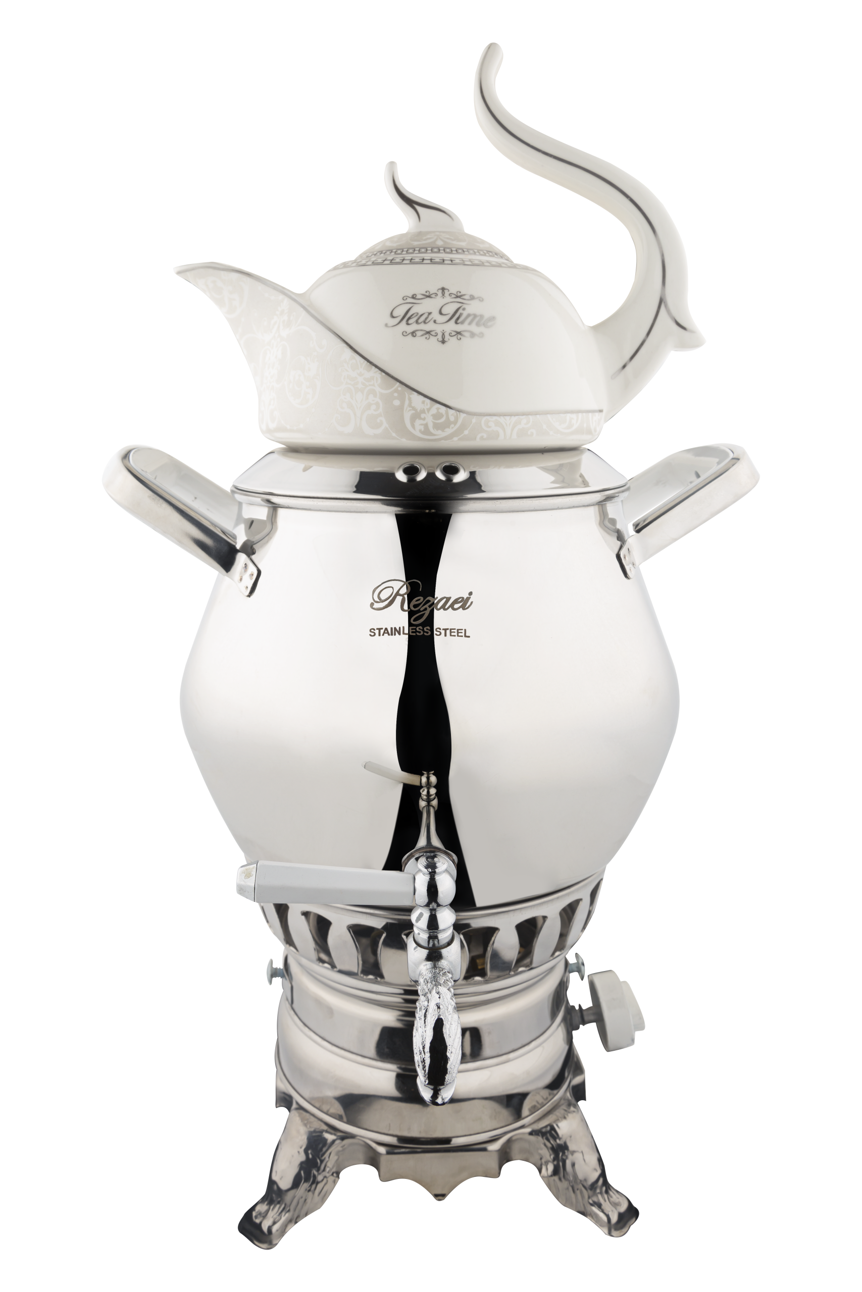 دستگیرههای این سماور از جنس استیل و باکالیت سفید است که ضدحرارت و بسیار خوش دست و ایمن هستند.