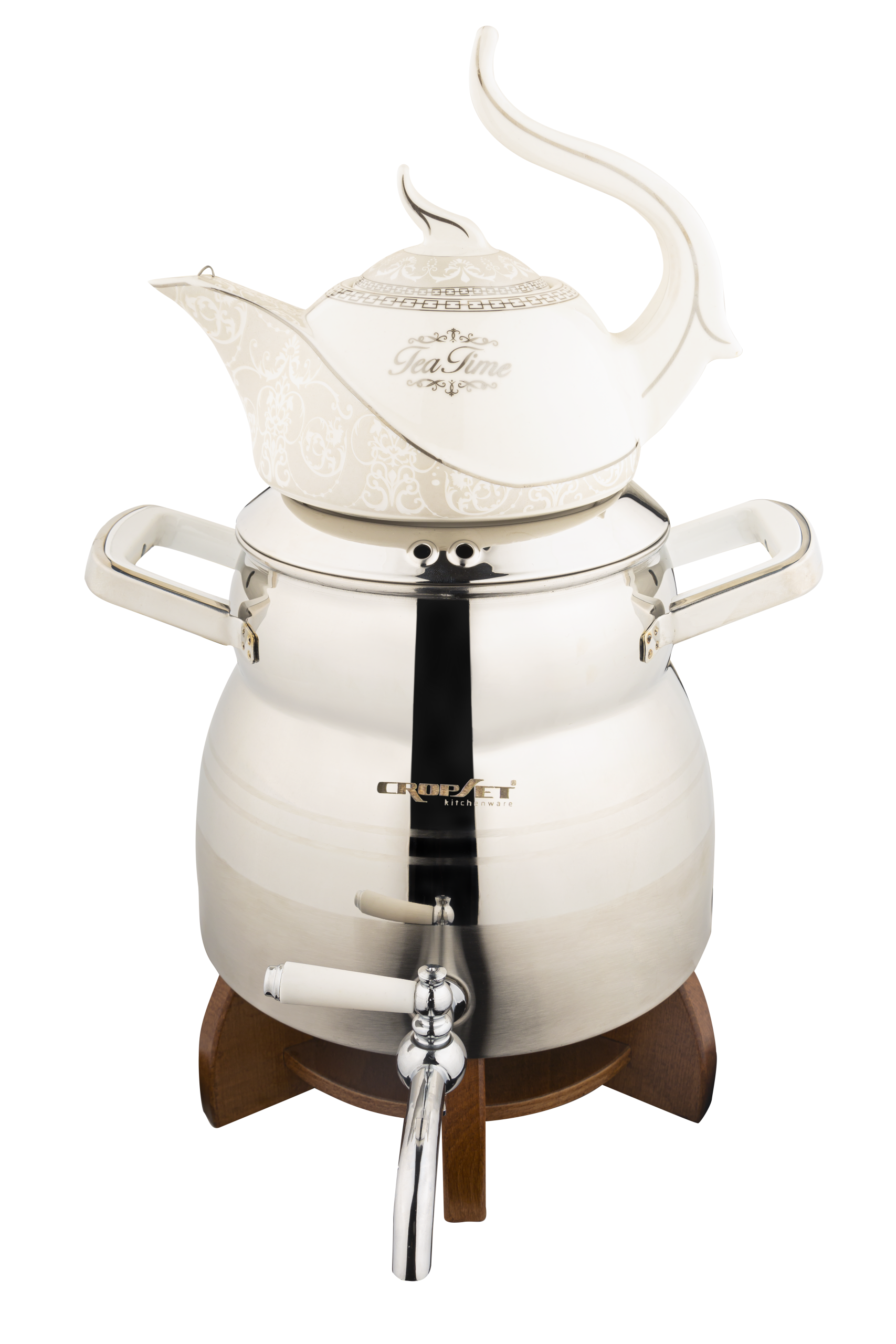 کتری و قوری استیل نقره ای براق کروپ ست مدل آوینا کد 203W با ظرفیت 5.5 لیتر به همراه یک پایه وارمر چوبی، یک ترکیب ایده آل، چشم نواز و درخشان برای مصرف روزانه خانواده های بزرگ و مهمانی ها است.