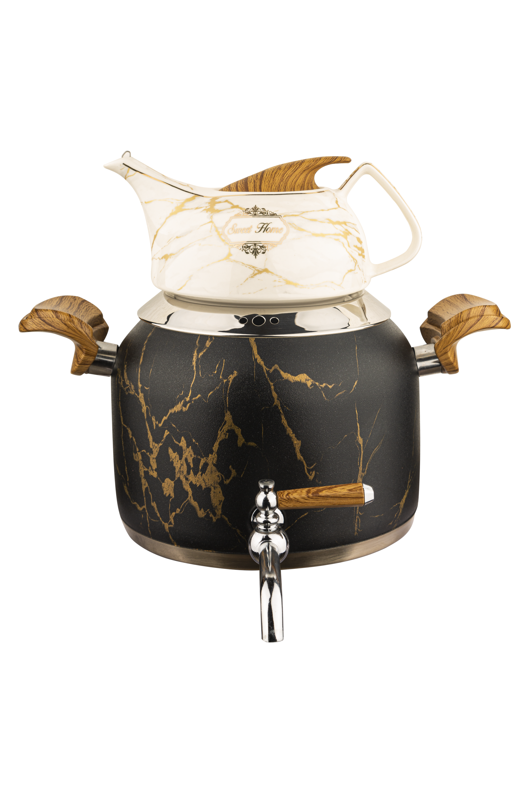 کتری و قوری استیل رنگی ماربل کروپ ست مدل کروپ کد 914 با ظرفیت 5.5 لیتر یک انتخاب شیک و ایده آل برای جمع های خانوادگی و مهمانی ها است. بدنه کتری از استیل 304 ضدزنگ و نسوز با پوشش رنگ الکترواستاتیک حرارتی تولید شده؛ که مقاوم در برابر زنگ زدگی، ضربه و حرارت است.