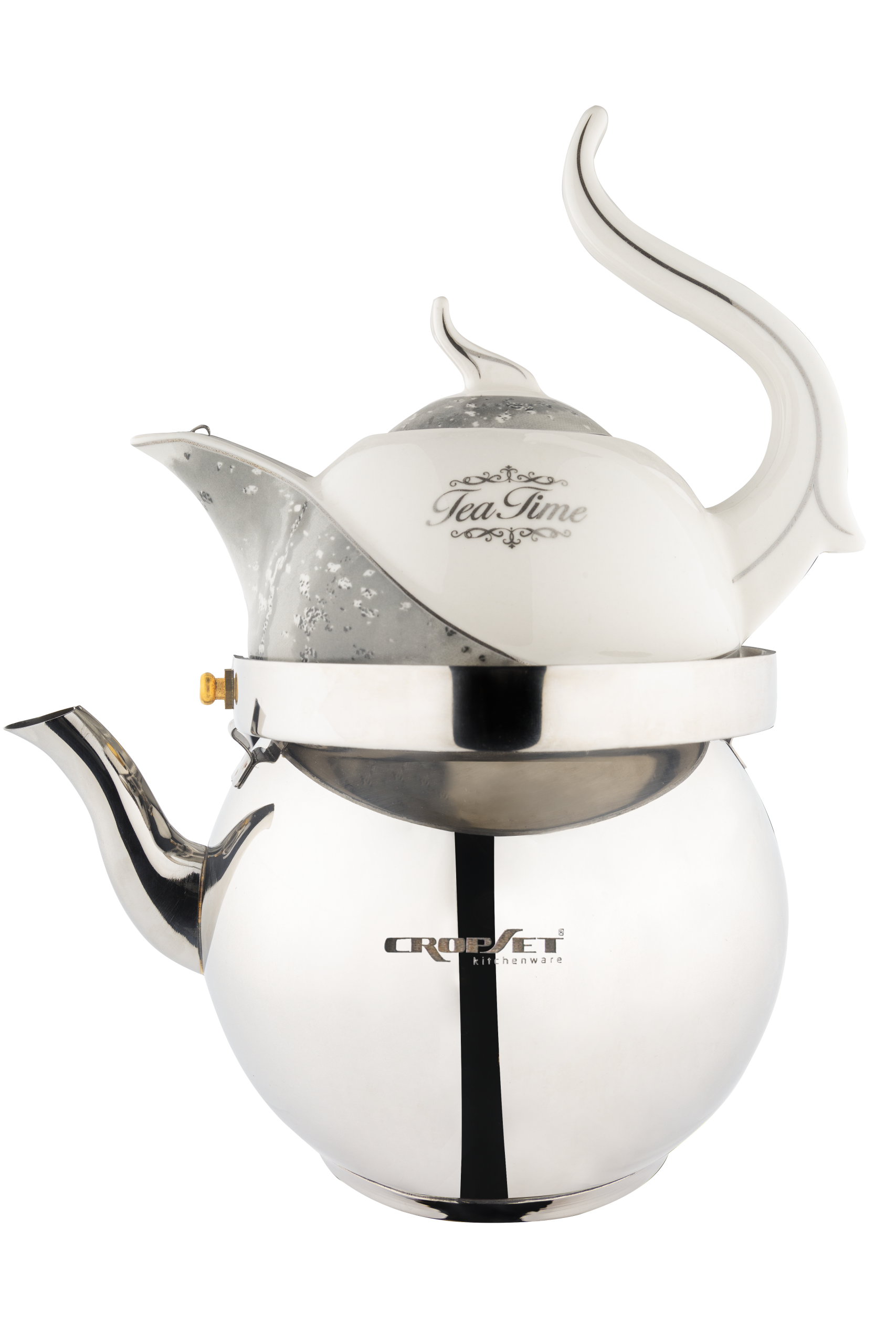 کتری و قوری استیل نقره ای براق کروپ ست مدل دنیز لوله دار کد 2303 با ظرفیت 3 لیتر، انتخاب عالی برای خانواده ها و مهمانی های کوچک است.
