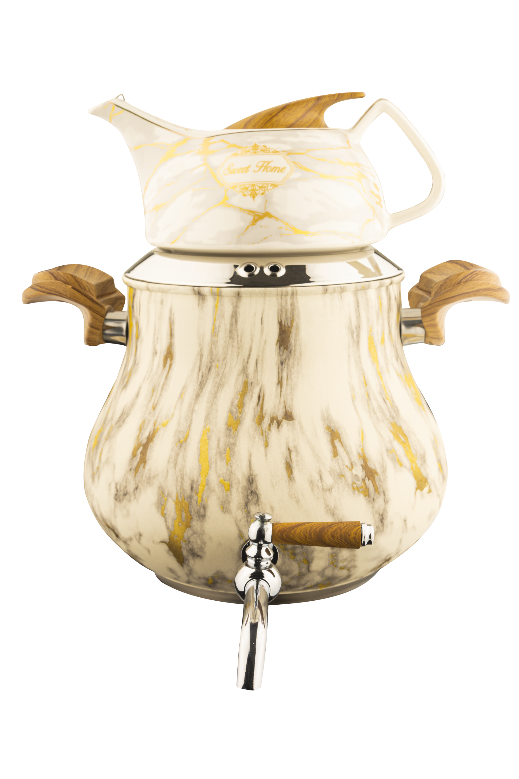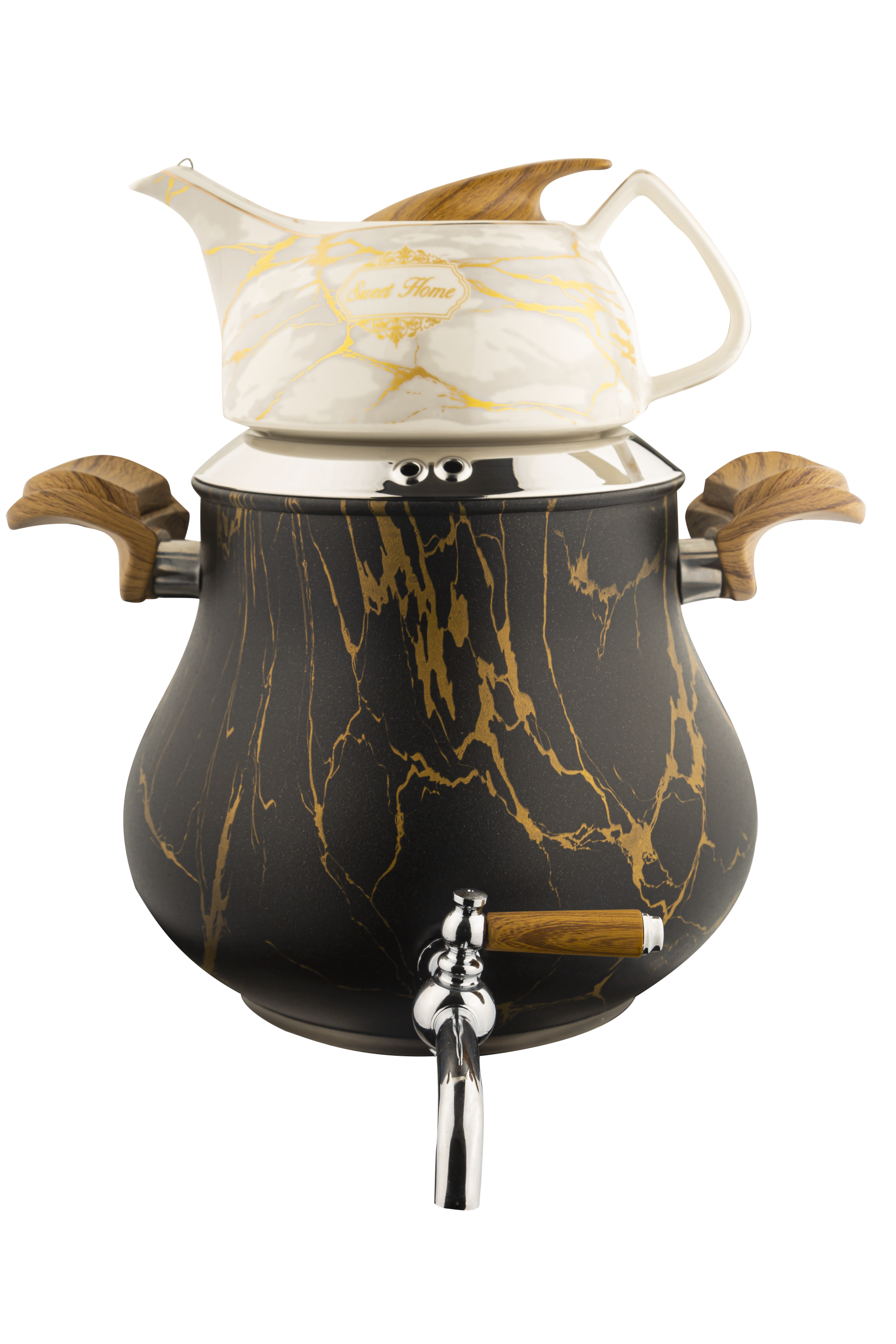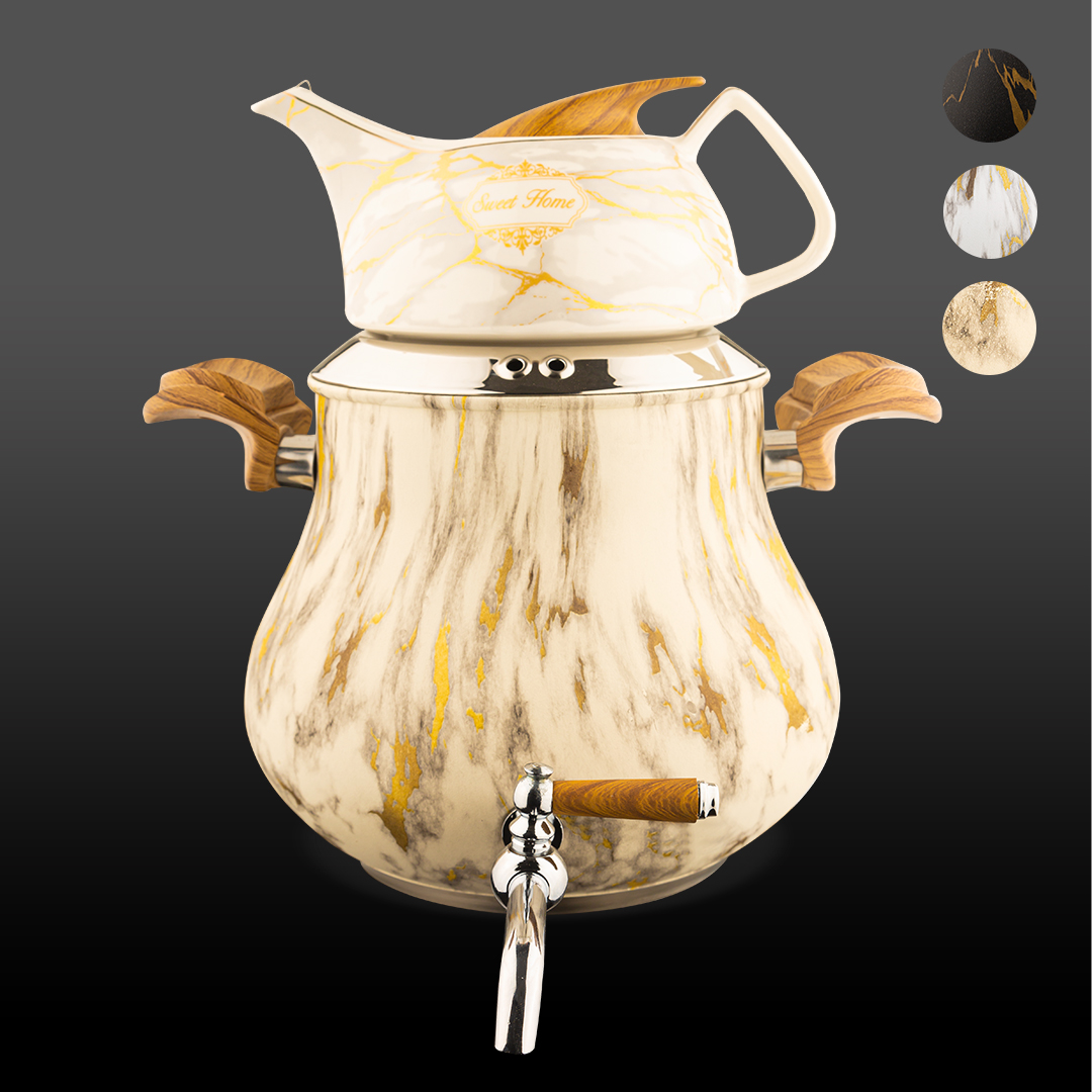 کتری و قوری استیل رنگی ماربل کروپ ست مدل السا کد 900 با ظرفیت 5.5 لیتر در 3 رنگ ماربل مشکی، ماربل سفید و ماربل کرم، ترکیبی از زیبایی و سادگی است؛ انتخابی ایده آل برای خوش سلیقه ها و خانواده های بزرگ و مهمانی های پرجمعیت است.