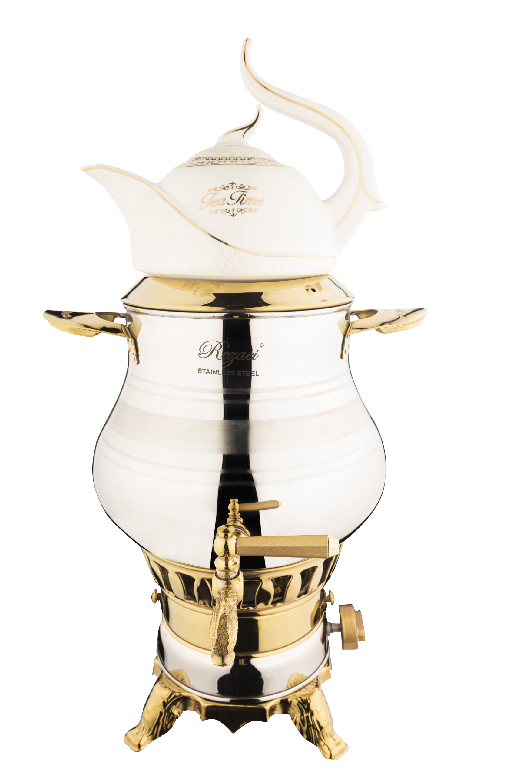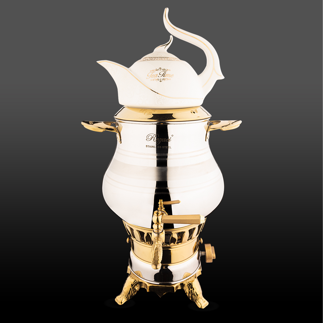 سماور 3 کاره استیل نقره ای و طلایی براق کروپ ست مدل السا کد 1061ST با ظرفیت 5.5 لیتر، یک انتخاب خاص و حرفه ای است و از استیل 304 ضد زنگ و نسوز براق تولید شده که علاوه بر ظاهر درخشان و زیبا، دوام و مقاومت بالایی در برابر حرارت و ضربه دارد و کاملاً برای خانواده های پرجمعیت و پذیرایی در مهمانی ها مناسب است.