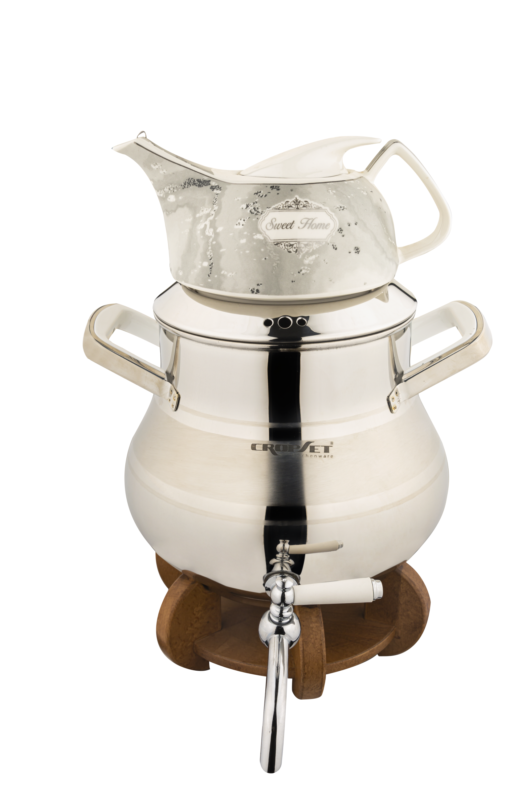 و پایه وارمر این کتری، از چوب راش با پوشش پلی اورتان ضد رطوبت تولید شده که هم ظاهر ست را گرمتر کرده و هم باعث می شود که کتری همیشه روی حرارت ملایم شمع، گرم بماند و چای همیشه آماده ی سرو باشد.