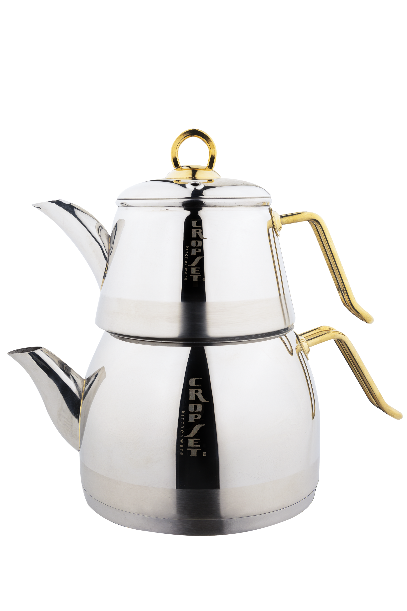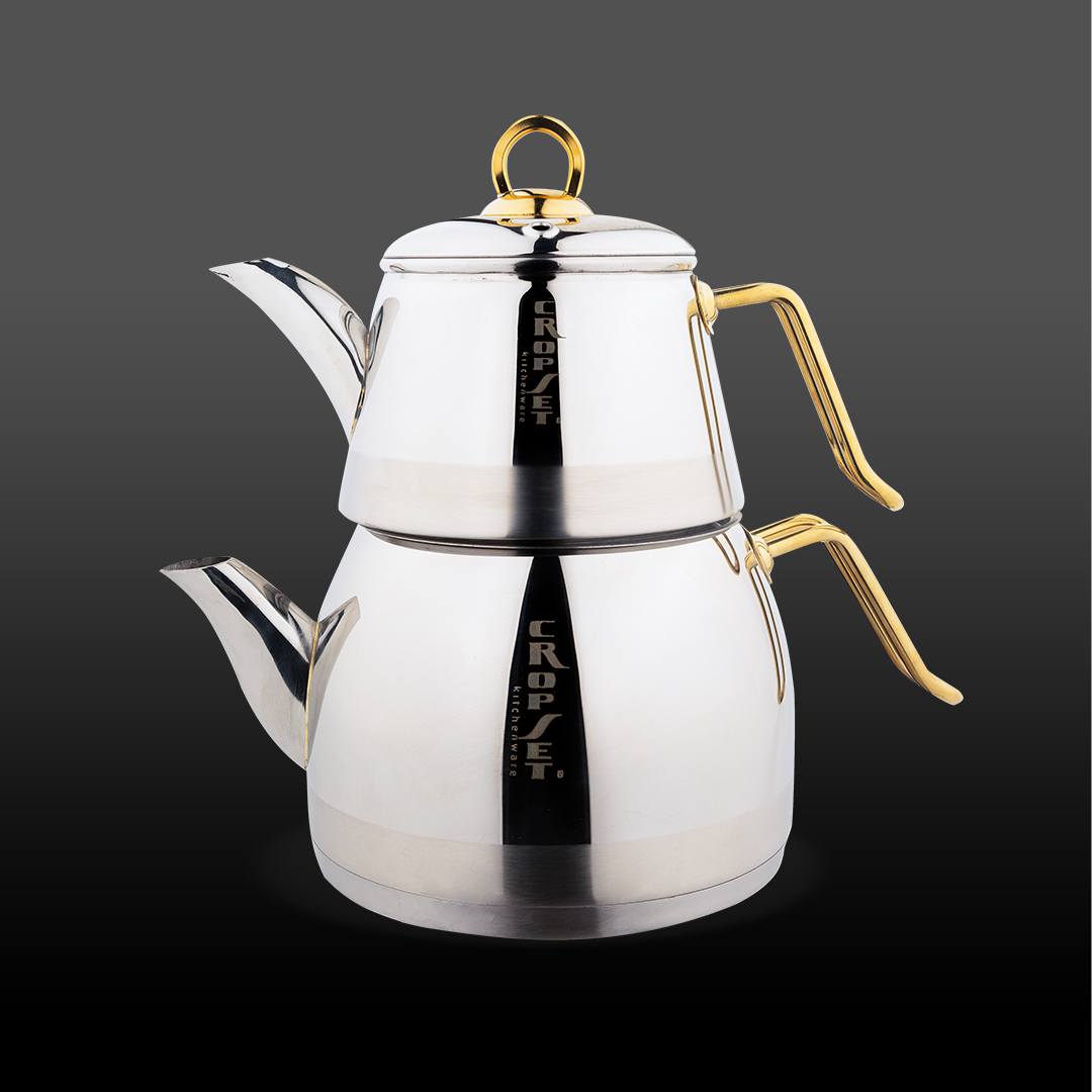 کتری و قوری استیل نقره ای و طلایی براق کروپ ست مدل اریک لوله دار کد 2406، جلوه ای از ظرافت مدرن و اصالت کلاسیک است.