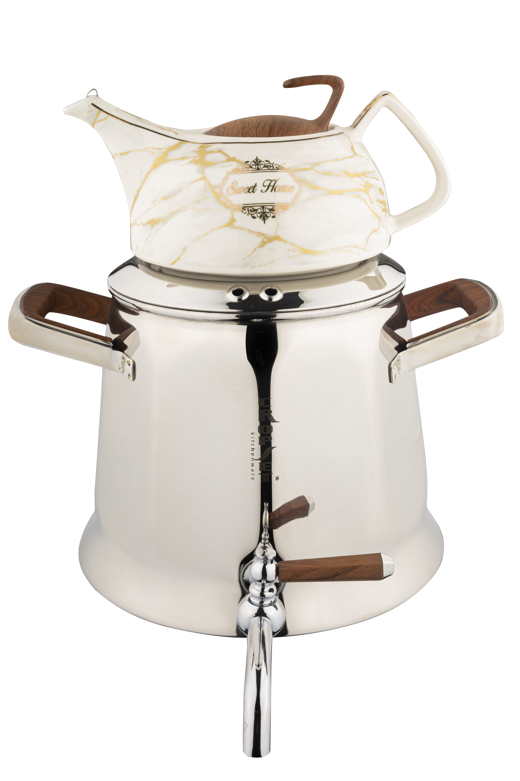 طراحی قوری با خطوط طلایی از طلای 18 عیار و خطوط نقرهای از پلاتین انجام شده که هم قابل شستشو است و هم در طول زمان رنگ و جلای خودش را از دست نمیدهد.