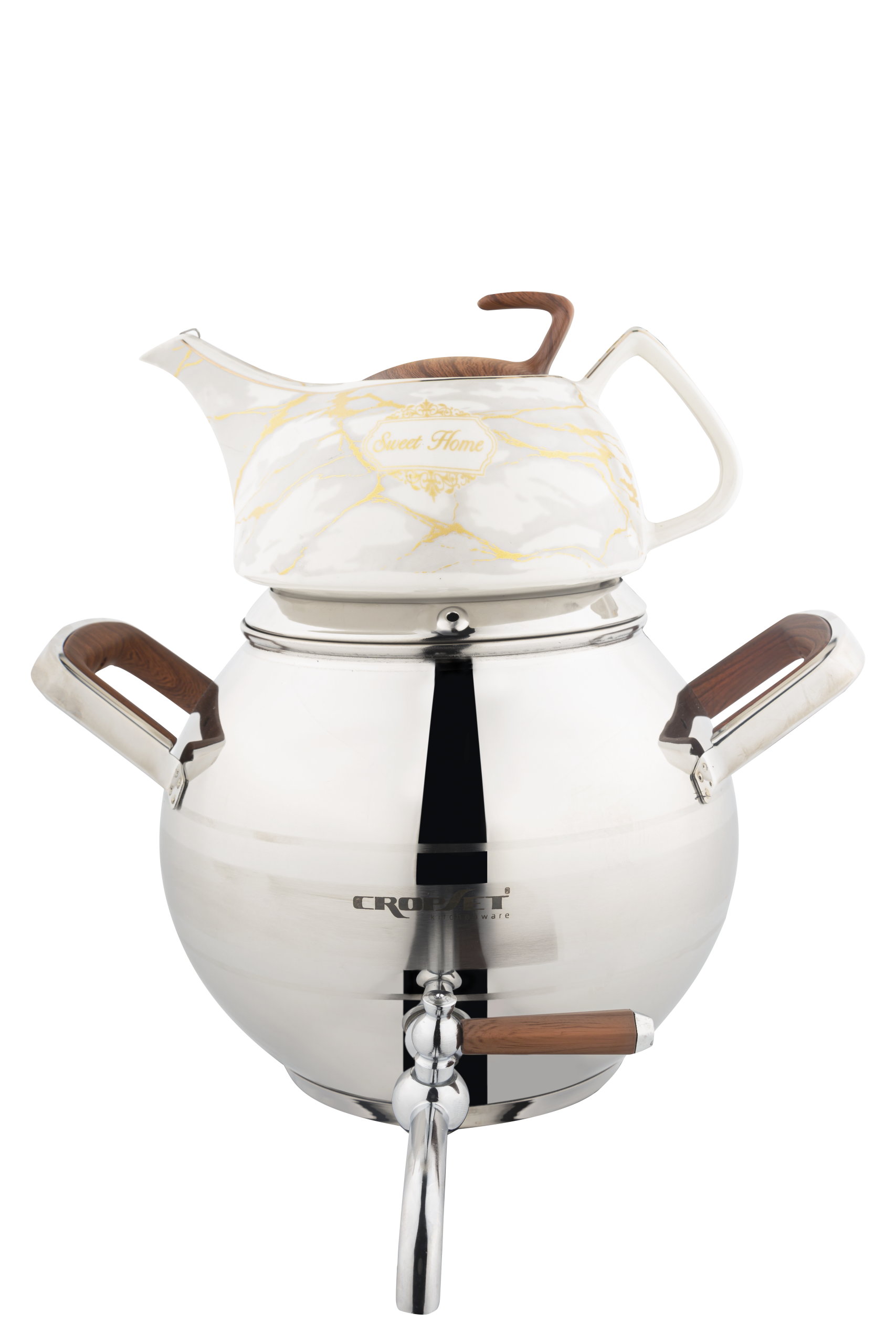 کتری و قوری استیل نقره ای براق کروپ ست مدل کیانا کد 801 با ظرفیت 5 لیتر، یک انتخاب خاص و خوش ساخت برای خانواده هایی است که هم کیفیت برای آن ها مهم است، و هم زیبایی ظاهر.
