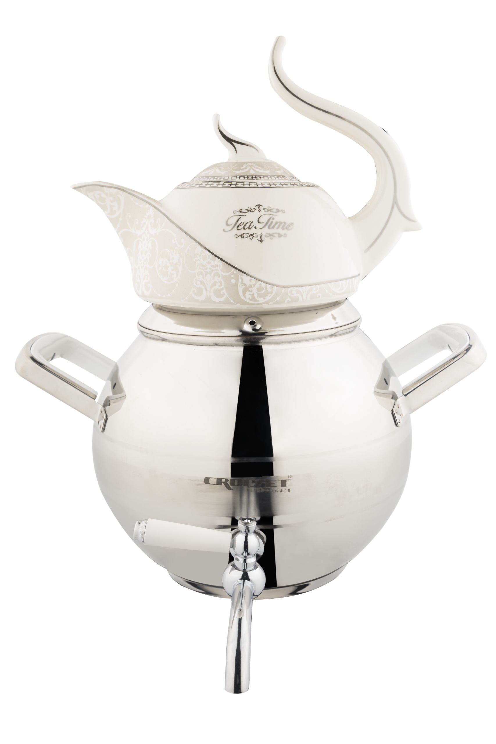 کتری و قوری استیل نقره ای براق کروپ ست مدل کیانا کد 801W با ظرفیت 5 لیتر، با طراحی ساده ولی خاص، در هر دکوری می درخشد.