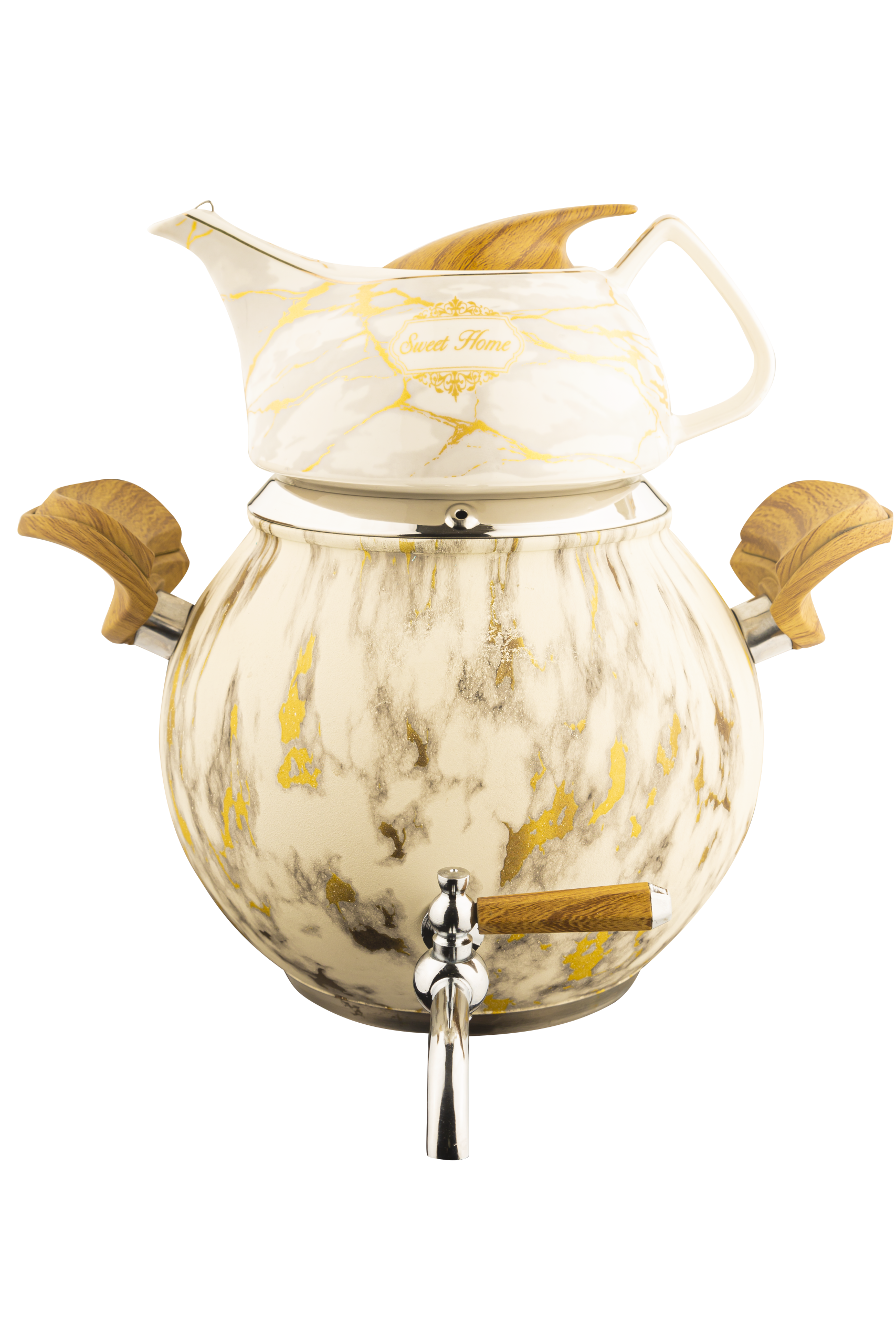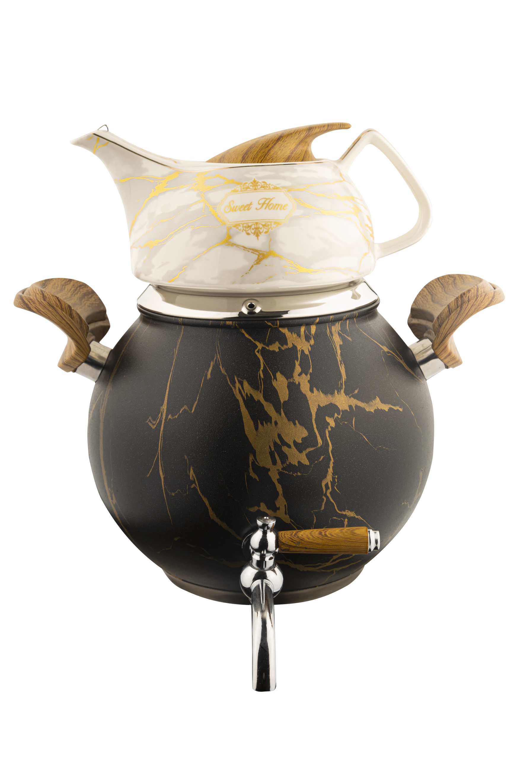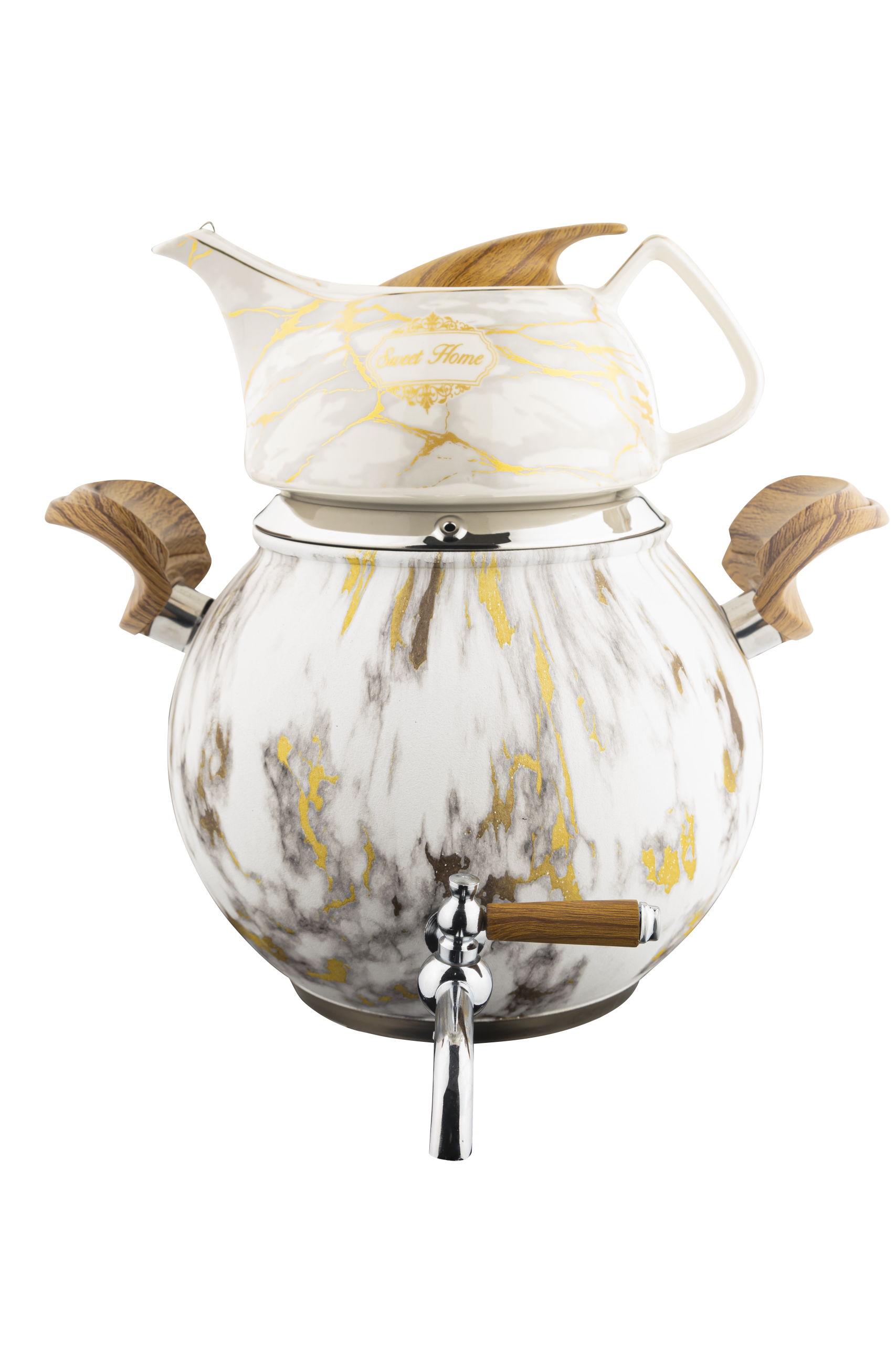 کتری و قوری رنگی ماربل کروپ ست مدل کیانا کد 507M با ظرفیت 5 لیتر از جنس استیل 304 ضد زنگ و نسوز، با پوشش رنگی ماربل از جنس الکترواستاتیک حرارتی تولید شده، و در 3 رنگ، مشکی، سفید و کرم که طراحی زیبا و مدرنی دارد، موجود است.