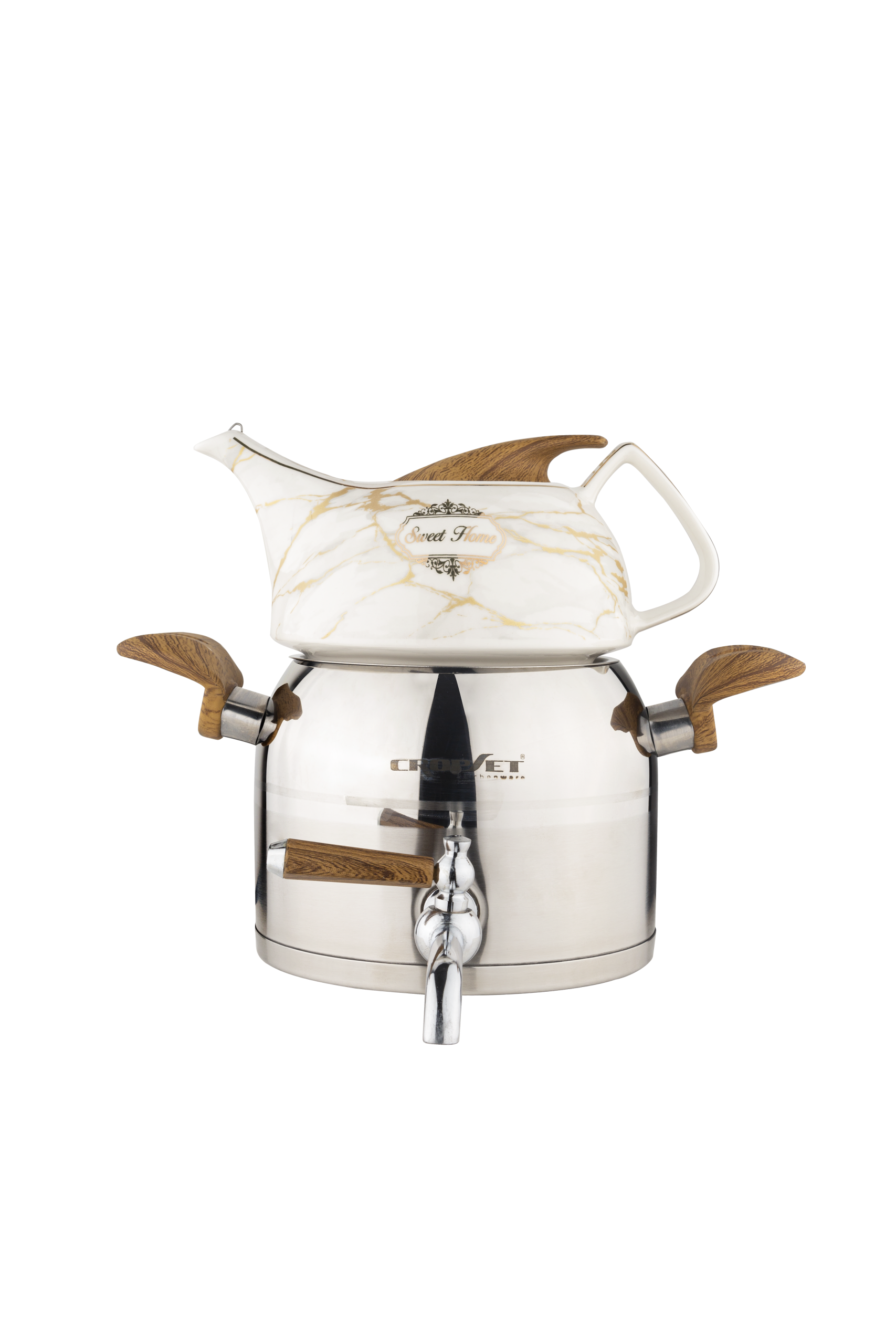 کتری و قوری استیل نقره ای براق کروپ ست مدل ماهور کد 3301 با ظرفیت 2.5 لیتر، و طراحی مینیمال و جمع و جور مخصوص خانواده ها و مهمانی های کوچک است.