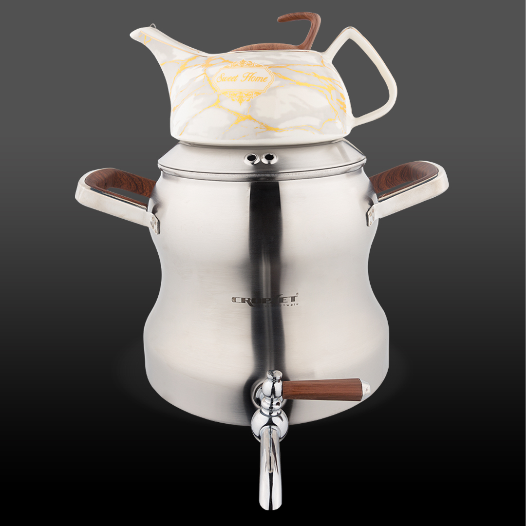 کتری و قوری استیل نقره ای مات کروپ ست مدل رونیکا کد 1804 با ظرفیت 5 لیتر، به آشپزخانه شما حال و هوای مدرن و خاص می دهد، و برای خانواده های بزرگ و مهمانی ها بسیار مناسب است.