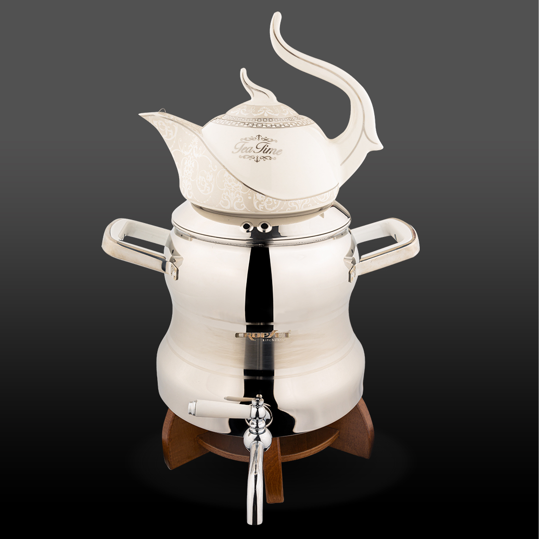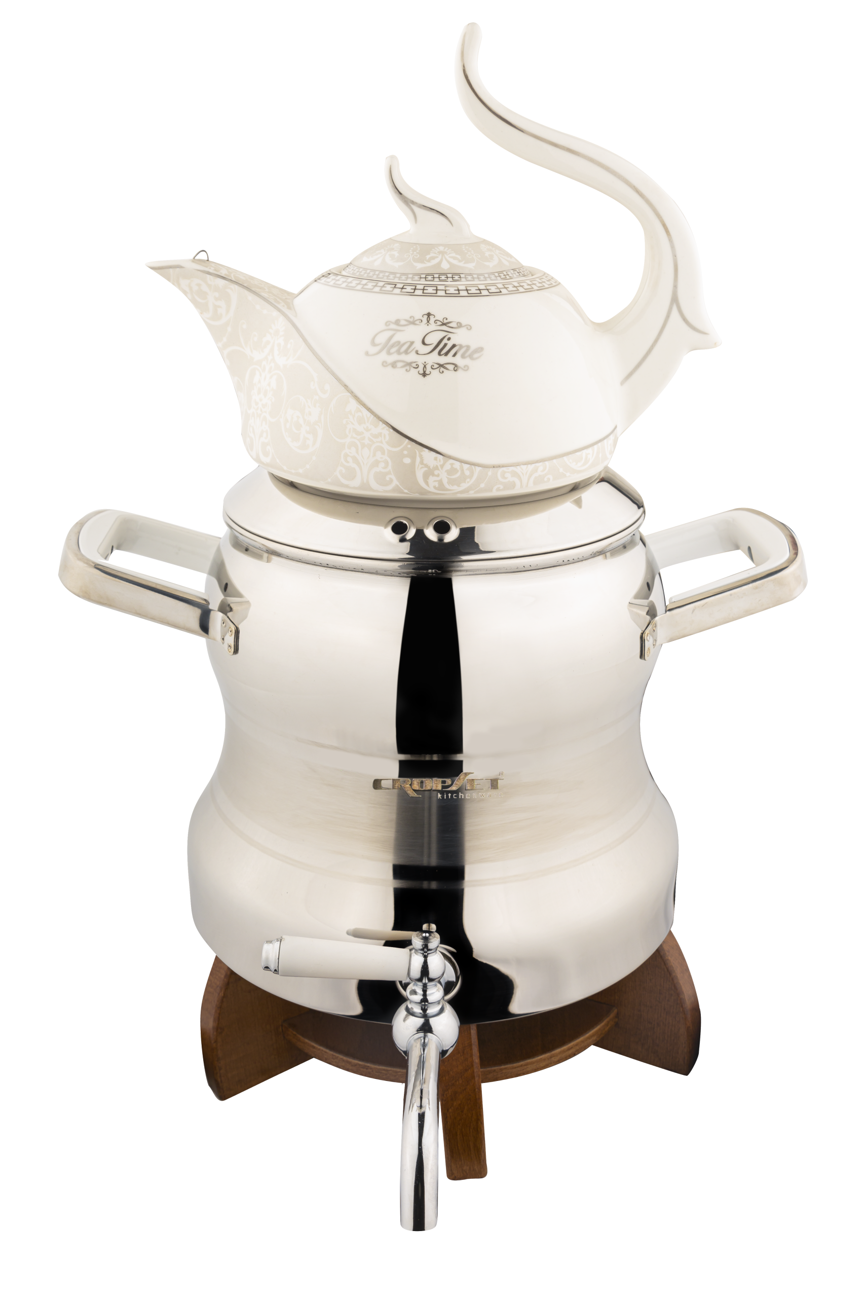 کتری و قوری استیل نقره ای براق کروپ ست مدل رونیکا کد 2804W با ظرفیت 5 لیتر به همراه یک پایه وارمر چوبی، با طراحی مدرن، بدنه ی استیل نقره ای براق و پایه ی چوبی گرم و چشم نواز، یک انتخاب خاص برای خانواده هایی است که به زیبایی و کیفیت اهمیت می دهند.