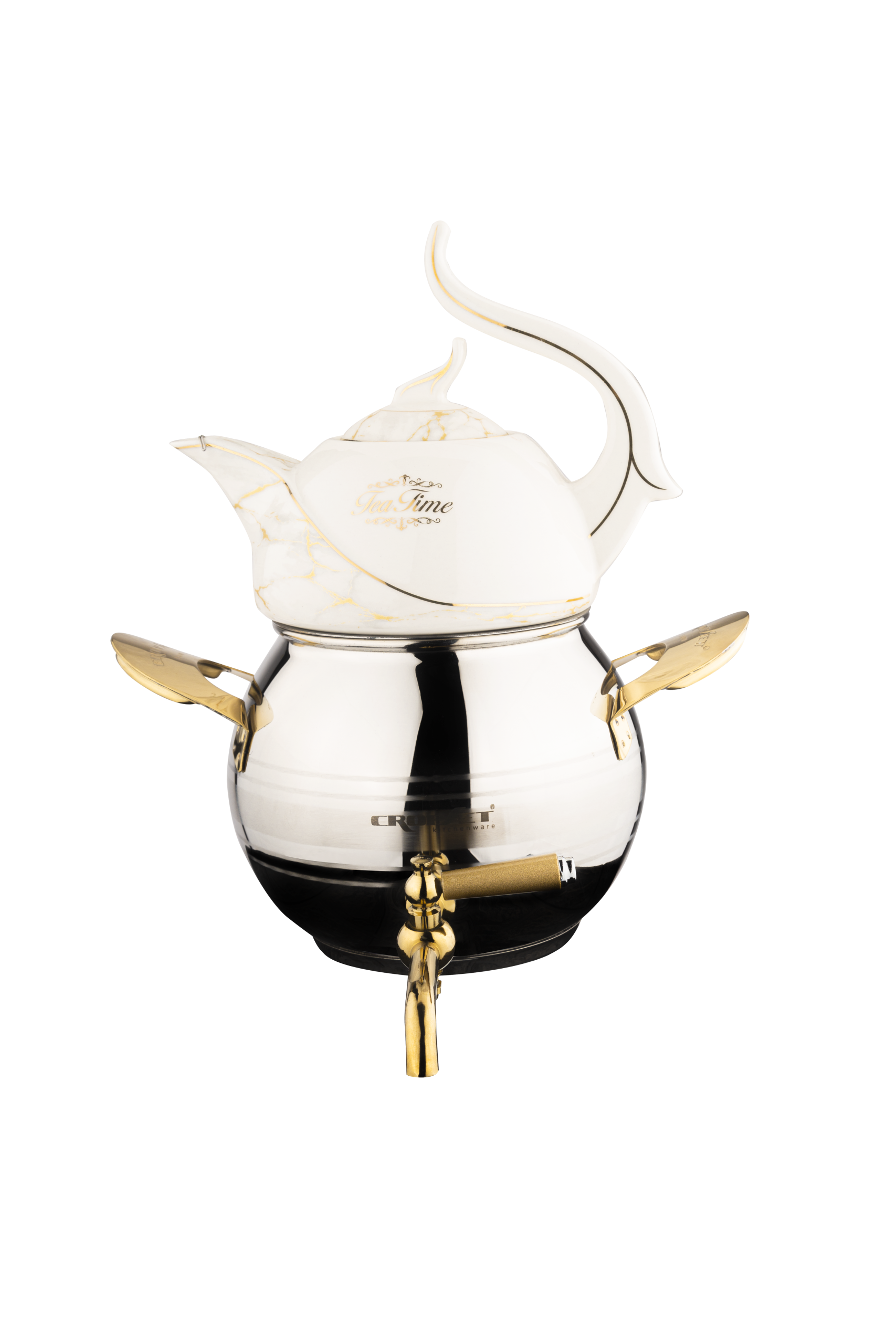 کتری و قوری استیل نقره ای و طلایی براق کروپ ست مدل روشاک کد 609G با ظرفیت 3 لیتر، با طراحی کلاسیک، براق و چشم نواز مناسب مصرف روزانه و خانواده های کم جمعیت است.