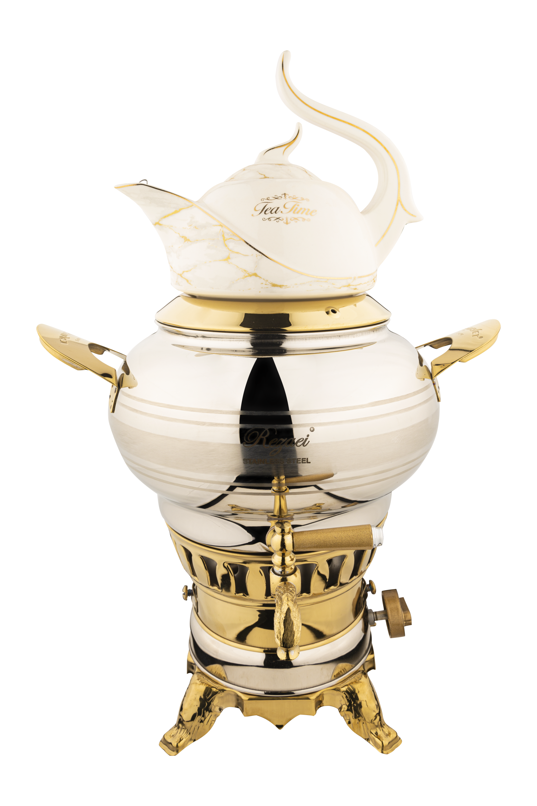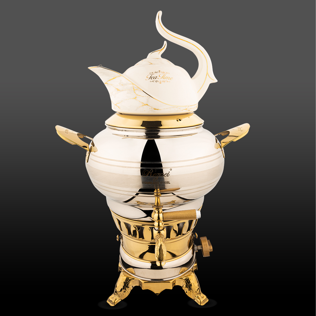 سماور 3 کاره استیل نقره ای و طلایی براق کروپ ست مدل ساحر کد 1024ST با ظرفیت 5.5 لیتر، یک انتخاب خاص و حرفه ای است و از استیل 304 ضد زنگ و نسوز براق تولید شده که علاوه بر ظاهر درخشان و زیبا، دوام و مقاومت بالایی در برابر حرارت و ضربه دارد و کاملاً برای خانواده های پرجمعیت و پذیرایی در مهمانی ها مناسب است.