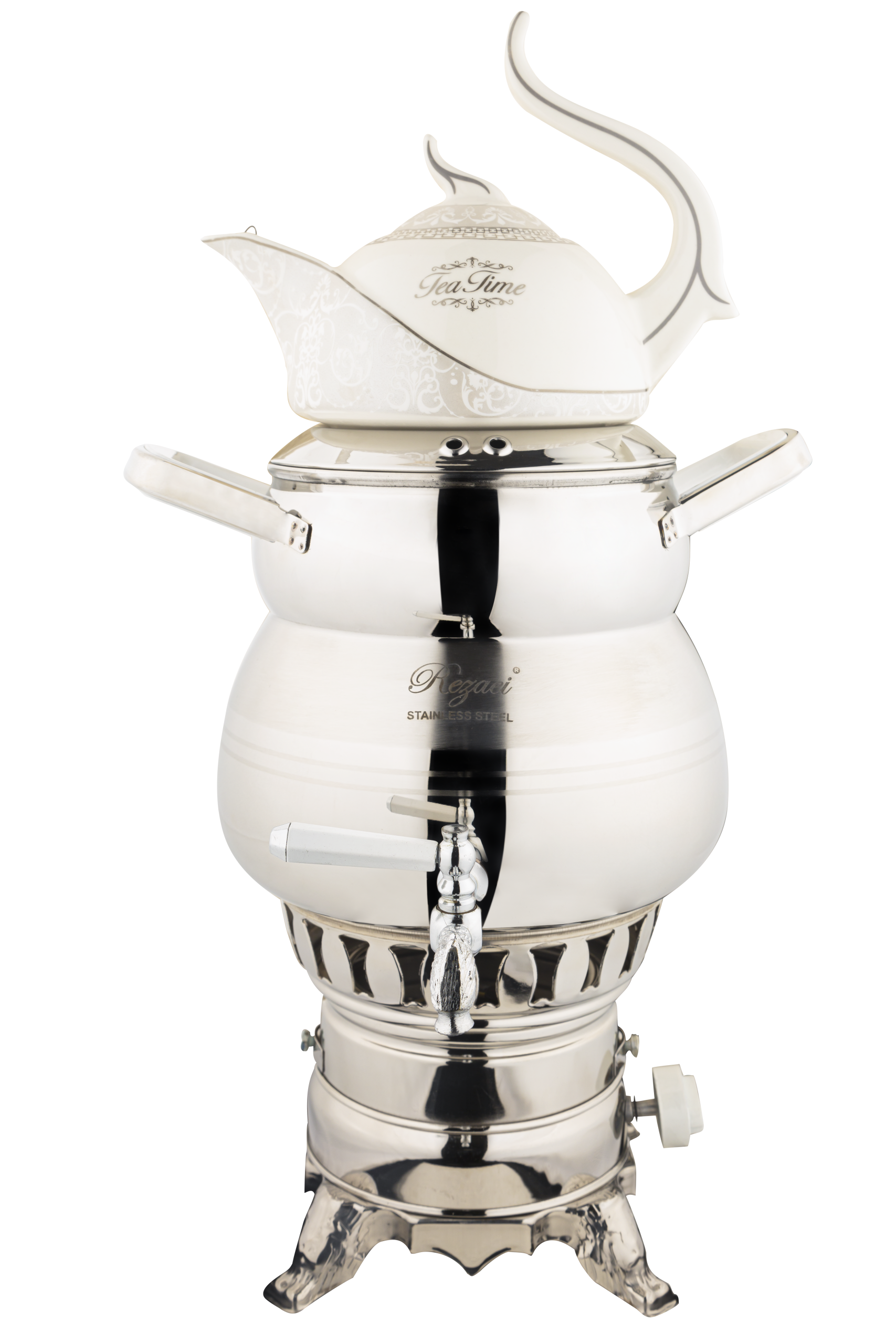 دستگیرههای این سماور از جنس استیل و باکالیت سفید است که ضدحرارت و بسیار خوش دست و ایمن هستند.