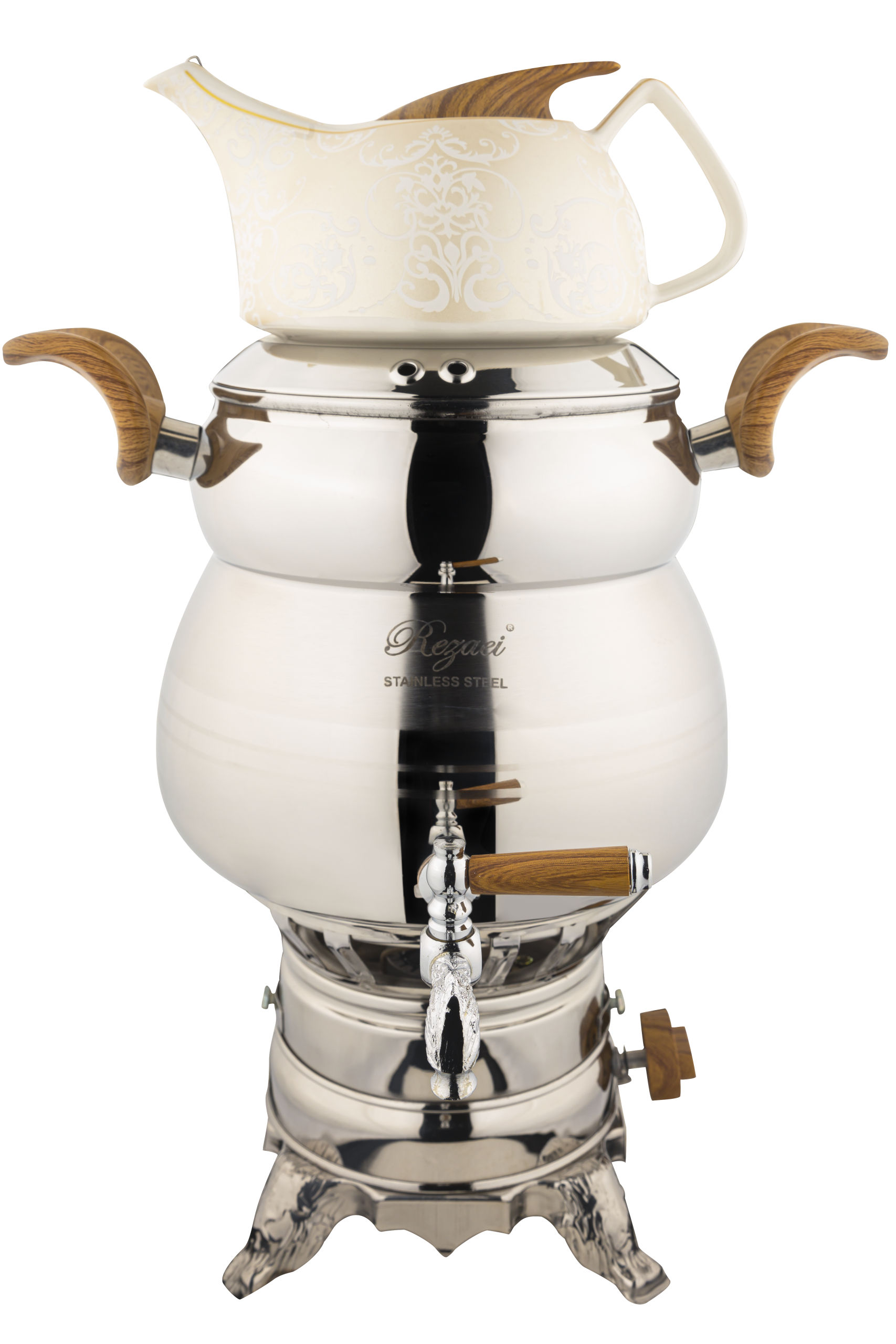 دستگیرههای این سماور از جنس باکالیت طرح چوب است که ضدحرارت و بسیار خوش دست و ایمن هستند.