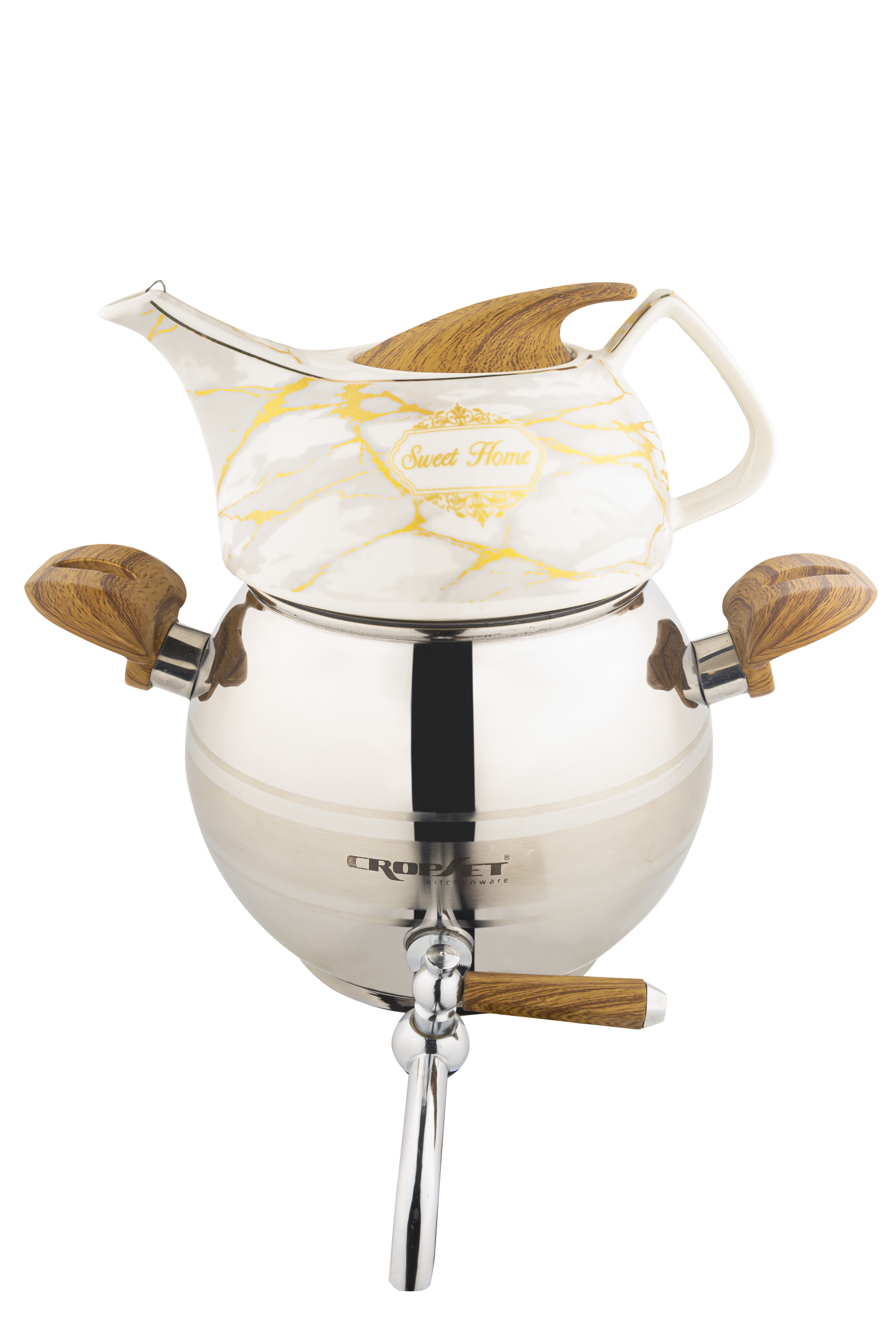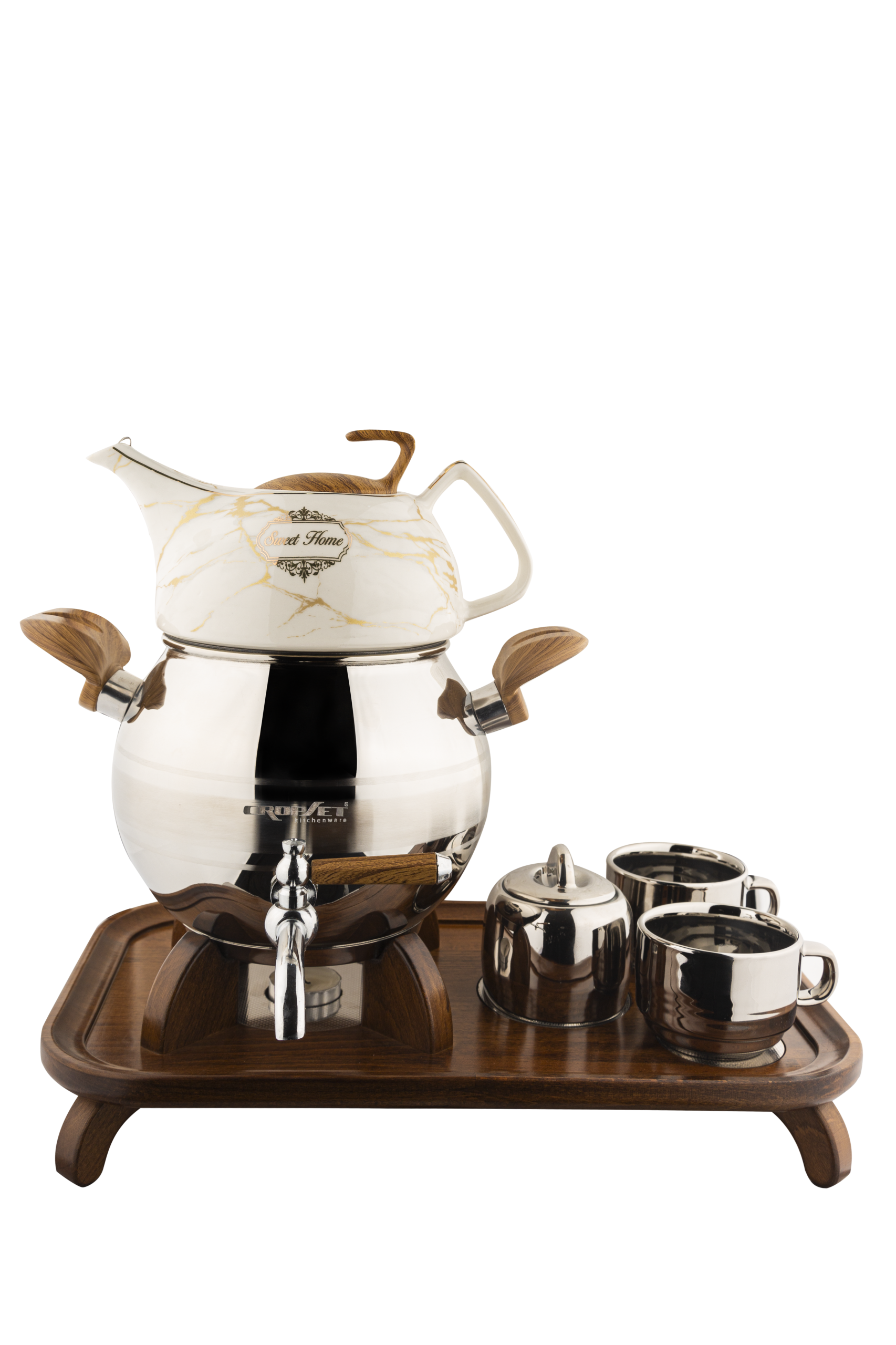 که به همراه یک سرویس پذیرایی نقره ای زیبا از جنس چینی مرغوب شامل: دو فنجان، و یک قندان و یک پایه وارمر شیک، از جنس چوب راش با پوشش پلی اورتان ضد رطوبت تولید شده که هم ظاهر ست را گرمتر کرده و هم باعث می شود که کتری همیشه روی حرارت ملایم شمع، گرم بماند و چای همیشه آماده ی سرو باشد.